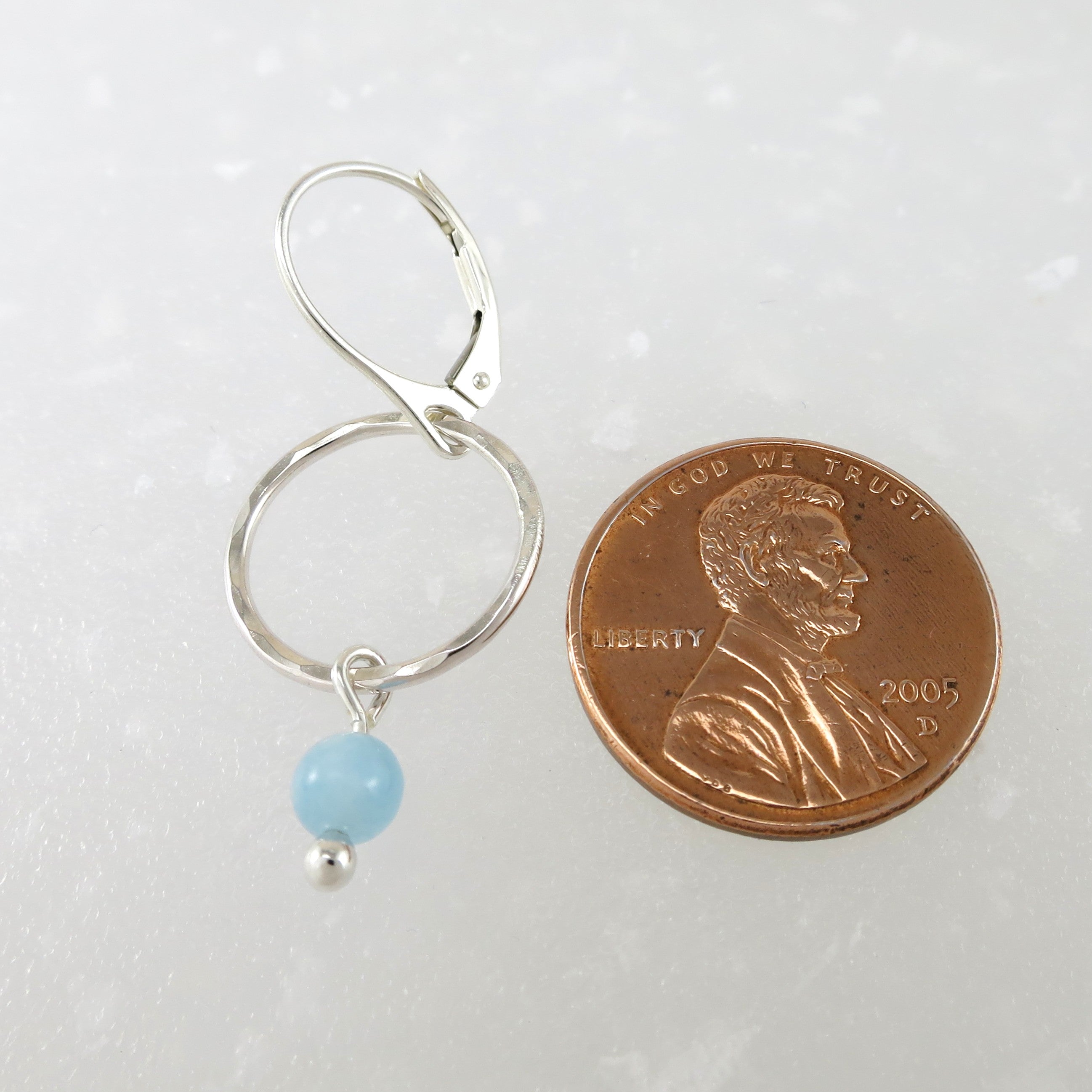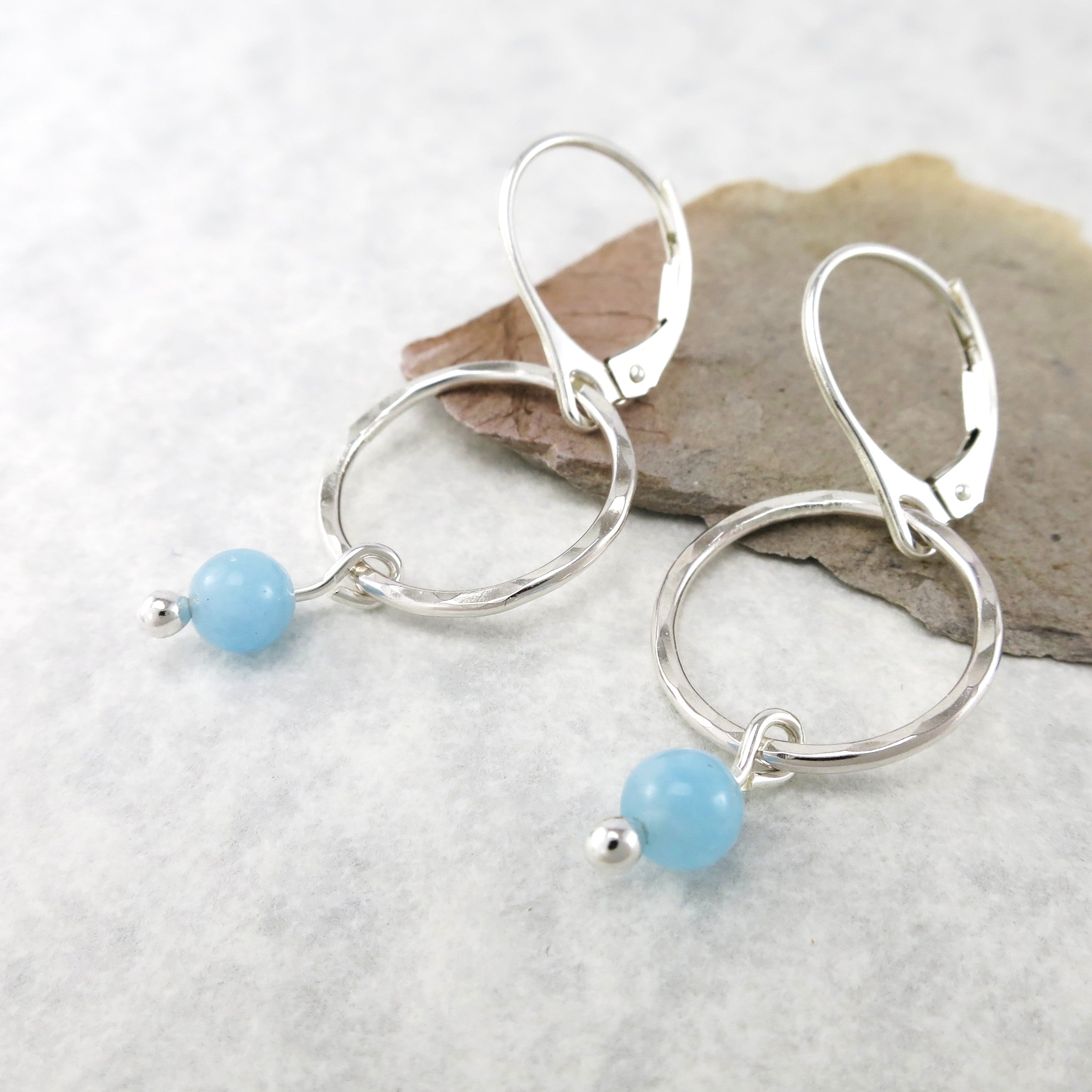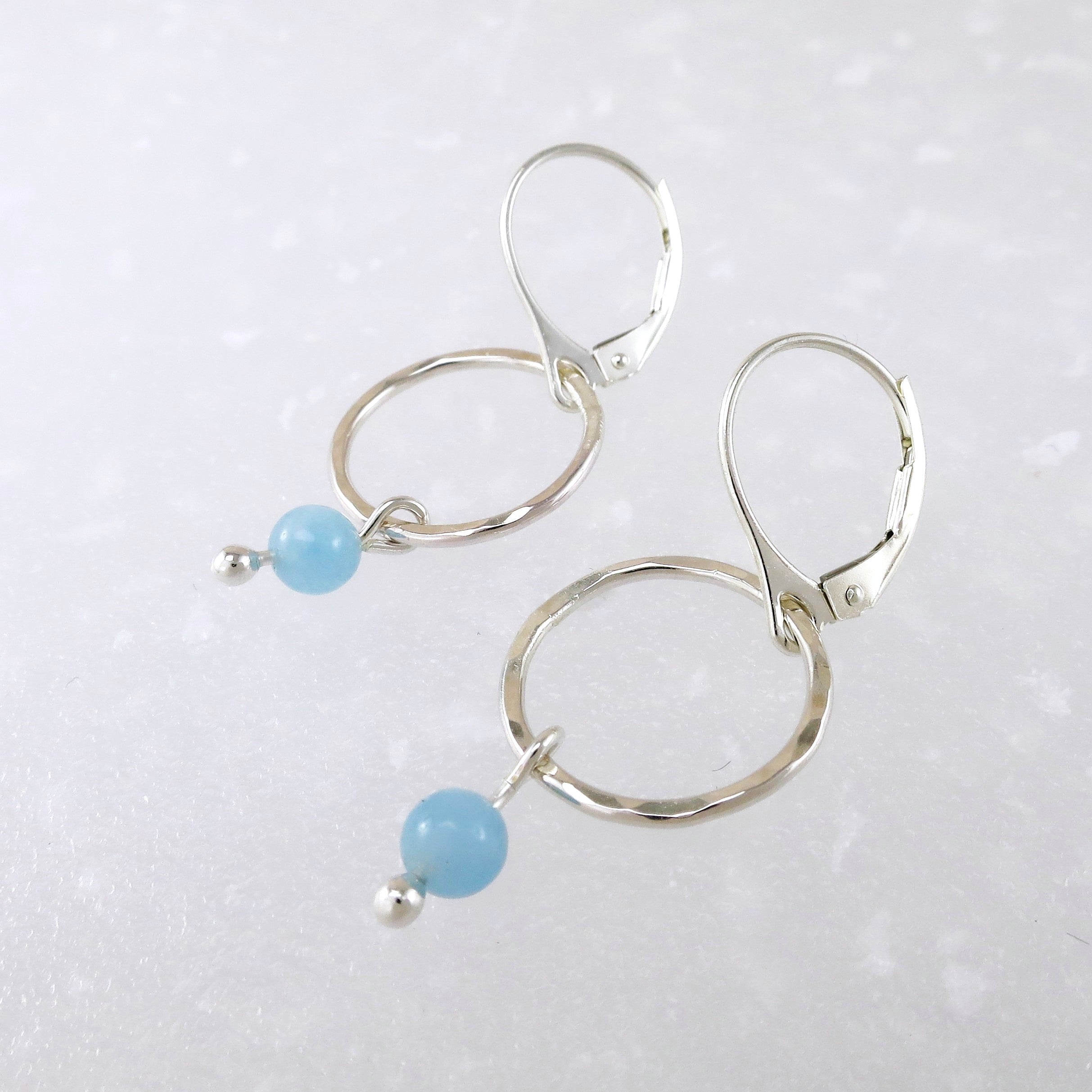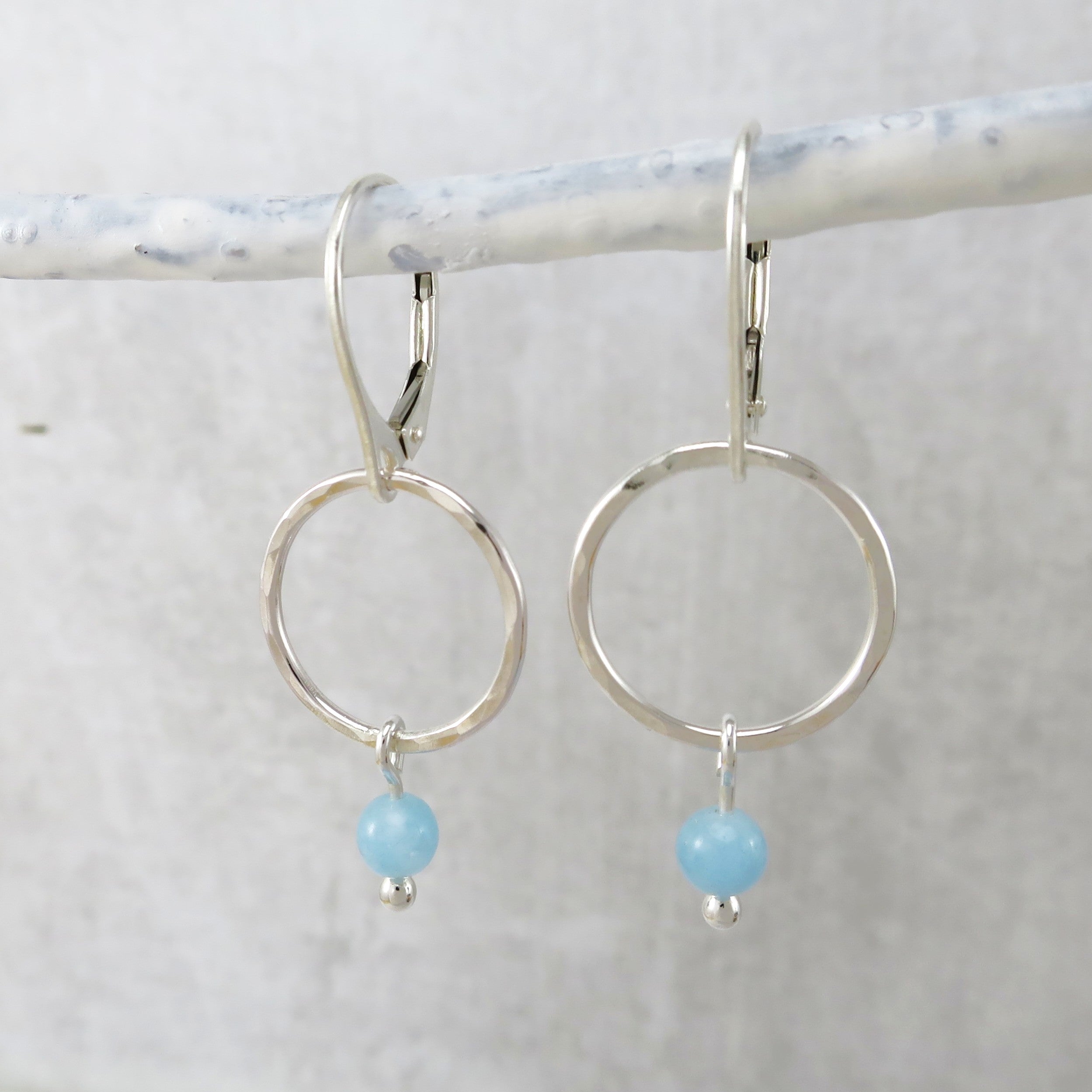 A soft circle of sterling silver frames a single aquamarine bead, with just enough movement to catch the light. Simple, balanced, and quietly striking.